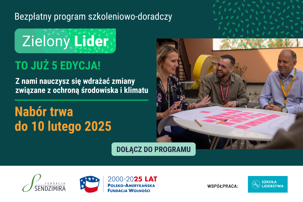 „Zielony Lider” to 9-miesięczny program Polsko-Amerykańskiej Fundacji Wolności, który realizuje Fundacja Sendzimira. Wspiera lokalnych liderów i liderki w działaniach na rzecz ochrony środowiska oraz mitygacji i adaptacji do zmiany klimatu, a także w skutecznym pozyskiwaniu funduszy na realizację tych działań. Na program składają się: