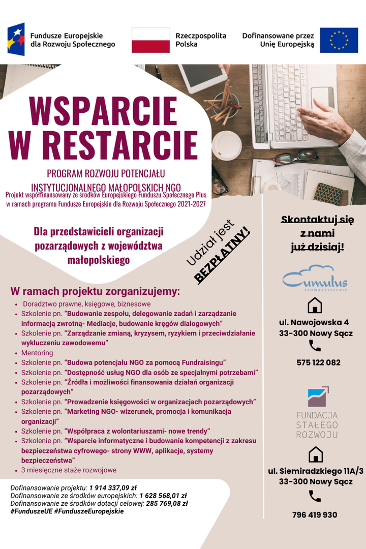 Fundacja Stałego Rozwoju wraz ze Stowarzyszeniem Inicjatyw Społecznych i Oświatowych Cumulus zapraszają na udział w projekcie „Wsparcie w RESTARCIE- Program rozwoju potencjału instytucjonalnego małopolskich NGO”.