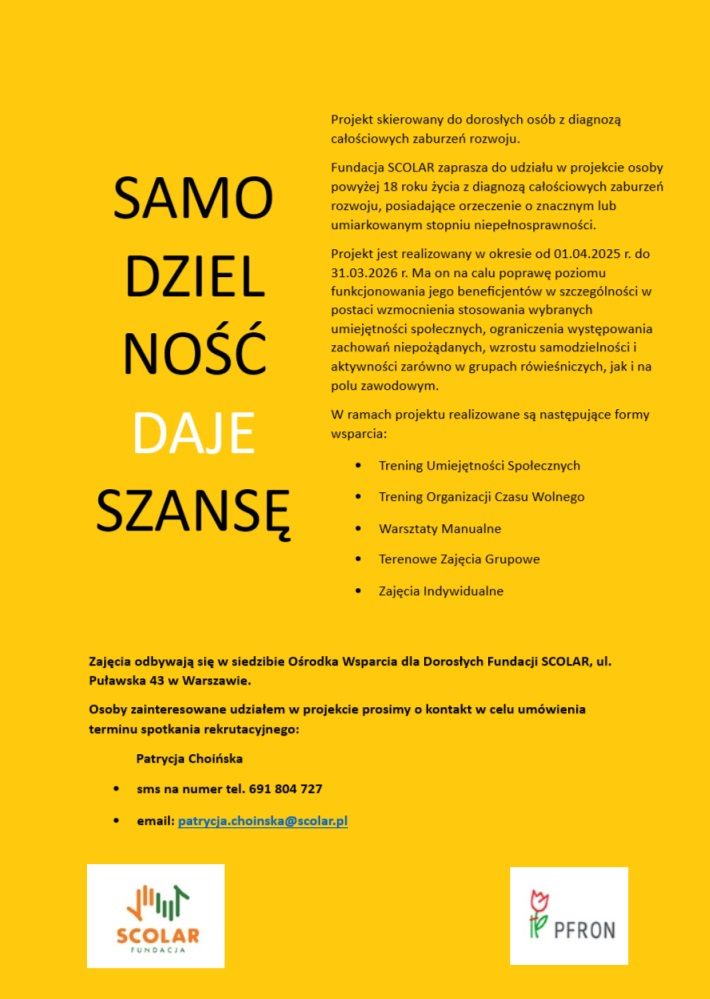 SAMODZIELNOŚĆ DAJE SZANSĘ - rozpoczynamy kolejny raz realizację 3 letniego projektu, którego głównym celem jest zwiększenie samodzielności 36 osób niepełnosprawnych powyżej 18 r.ż. z zaburzeniami rozwoju ze spektrum autyzmu, w szczególności z zespołem Aspergera (ZA), jak również całościowych zaburzeń rozwojowych ze sprzężoną niepełnosprawnością intelektualną.