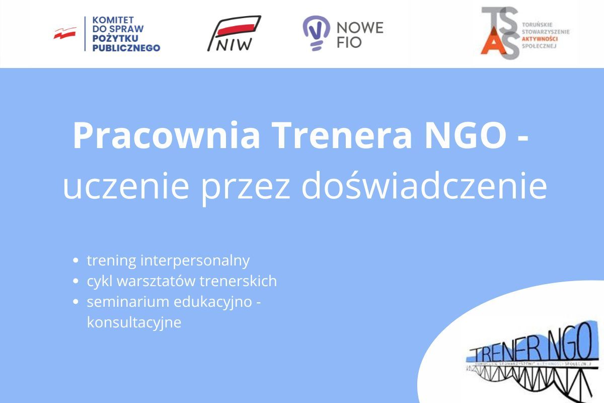 Pracownia Trenera NGO – uczenie przez doświadczenie: jest to warsztat rozwoju kompetencji trenerskich, liderskich osób ze środowiska organizacji obywatelskich – tzw, 3 sektora. Oferta skierowana jest do przedstawicieli środowiska ngo – członków, pracowników, wolontariuszy organizacji pozarządowych z województwa kujawsko-pomorskiego. Udział w projekcie jest nieodpłatny.