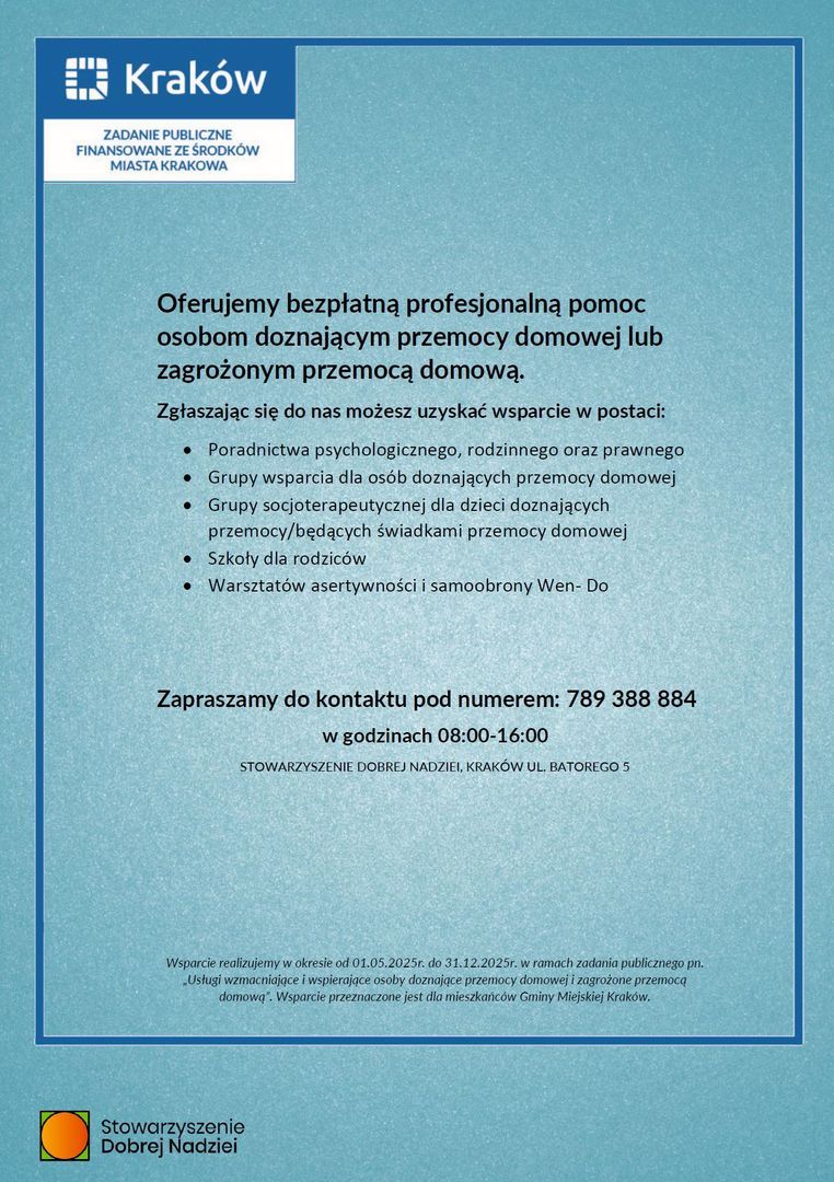 Wsparcie przeznaczone jest dla mieszkańców Gminy Miejskiej Kraków, zadanie finansowane ze środków GMK.