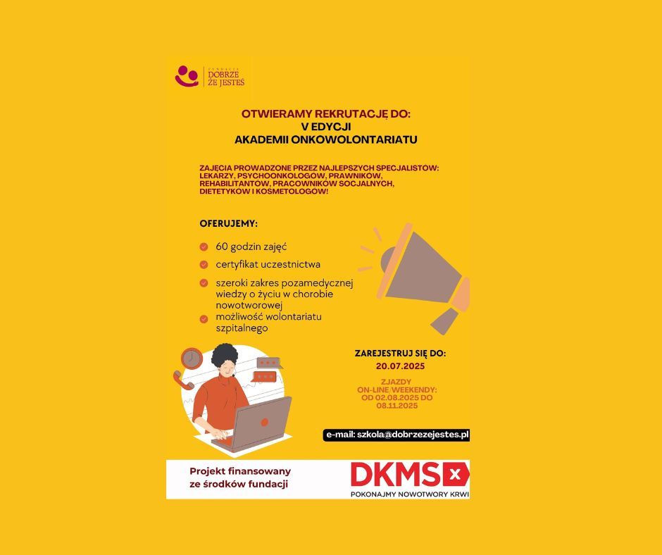 Zapraszamy do zgłaszania się do AKADEMII ONKOWOLONTARIATU!!! Zajęcia prowadzone są przez najlepszych specjalistów: lekarzy onkologów, psychoonkologów, prawników, pracowników socjalnych, rehabilitantów, kosmetologów i dietetyków! Terminy zjazdów on-line(weekendy) od 2.08.2025 do 08.11.2025. Razem z nami możesz zmienić życie osób z chorobami onkologicznymi i hematologicznymi na lepsze!