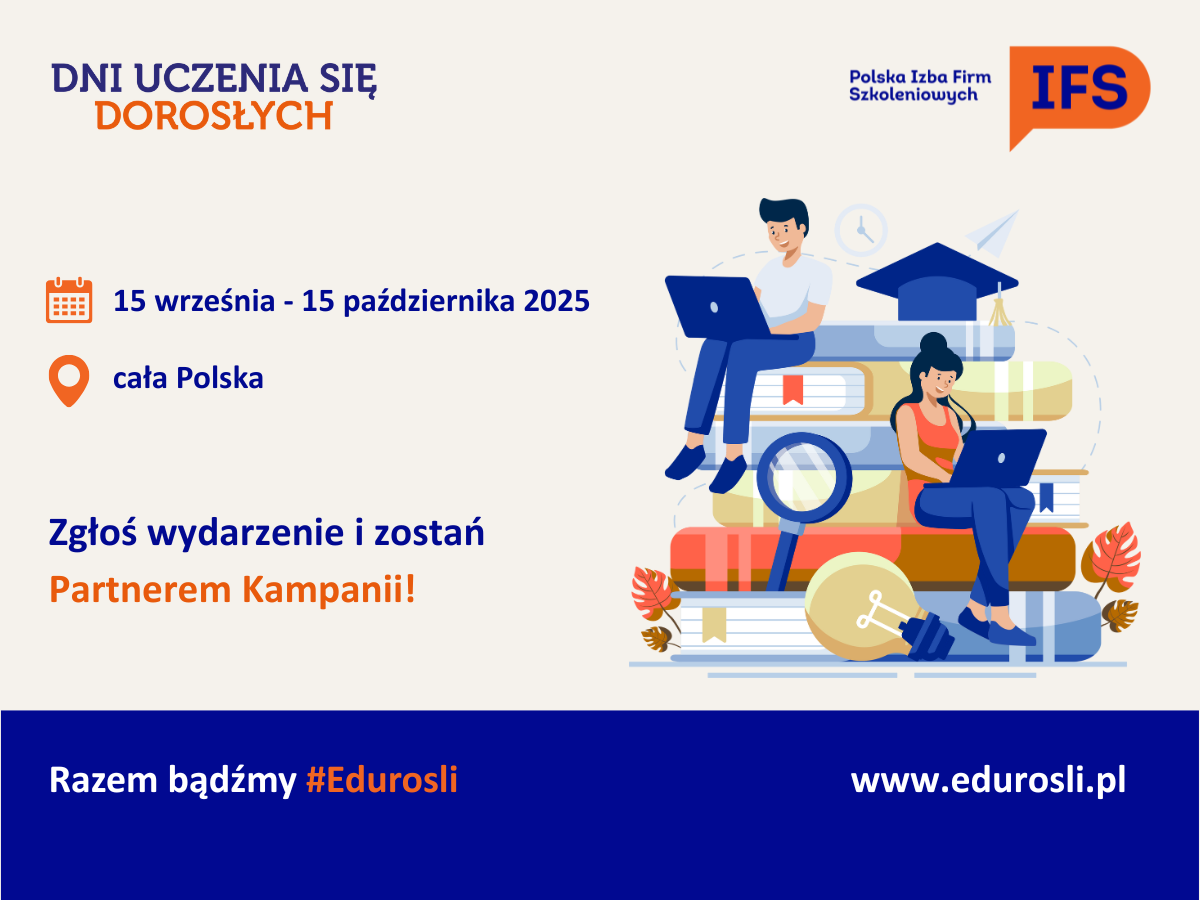 Kampania społeczna Dni Uczenia się Dorosłych 2025 to wydarzenie, którego organizatorem i koordynatorem jest Polska Izba Firm Szkoleniowych. Tegoroczna 6 edycja będzie trwała w całej Polsce od 15 września do 15 października 2025. Krytyczne myślenie to hasło przewodnie tegorocznej edycji kampanii. Inicjatywa kierowana jest do wszystkich grup wiekowych, zawodowych i społecznych. ,,Dni” będą realizowane w całej Polsce za pomocą różnorodnych wydarzeń.