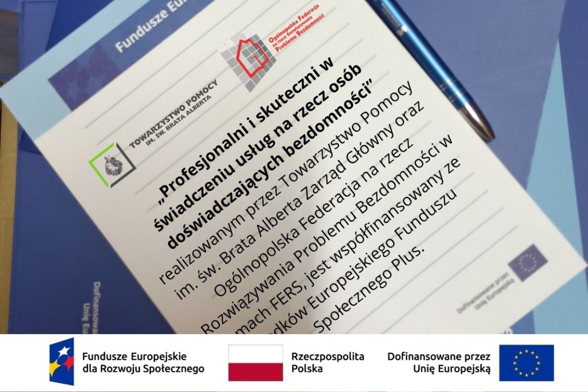 Partnerzy projektu: „Profesjonalni i skuteczni w świadczeniu usług na rzecz osób doświadczających bezdomności” realizowany jest przez Towarzystwo Pomocy im. św. Brata Alberta Zarząd Główny oraz Ogólnopolska Federacja na rzecz Rozwiązywania Problemu Bezdomności współfinansowany ze środków Europejskiego Funduszu Społecznego Plus.