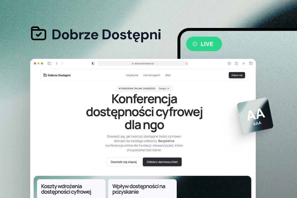 Konferencja DobrzeDostepni.pl powstała po to, by wesprzeć fundacje i stowarzyszenia w skutecznym docieraniu do każdego – bez wyjątku. Nie chodzi tylko o zgodność z przepisami prawa, ale przede wszystkim o realne zwiększenie zasięgu, siły oddziaływania i społecznego wpływu. Bo Wasze działania mają znaczenie. Zadbajmy razem, by były naprawdę dostępne - dla wszystkich.