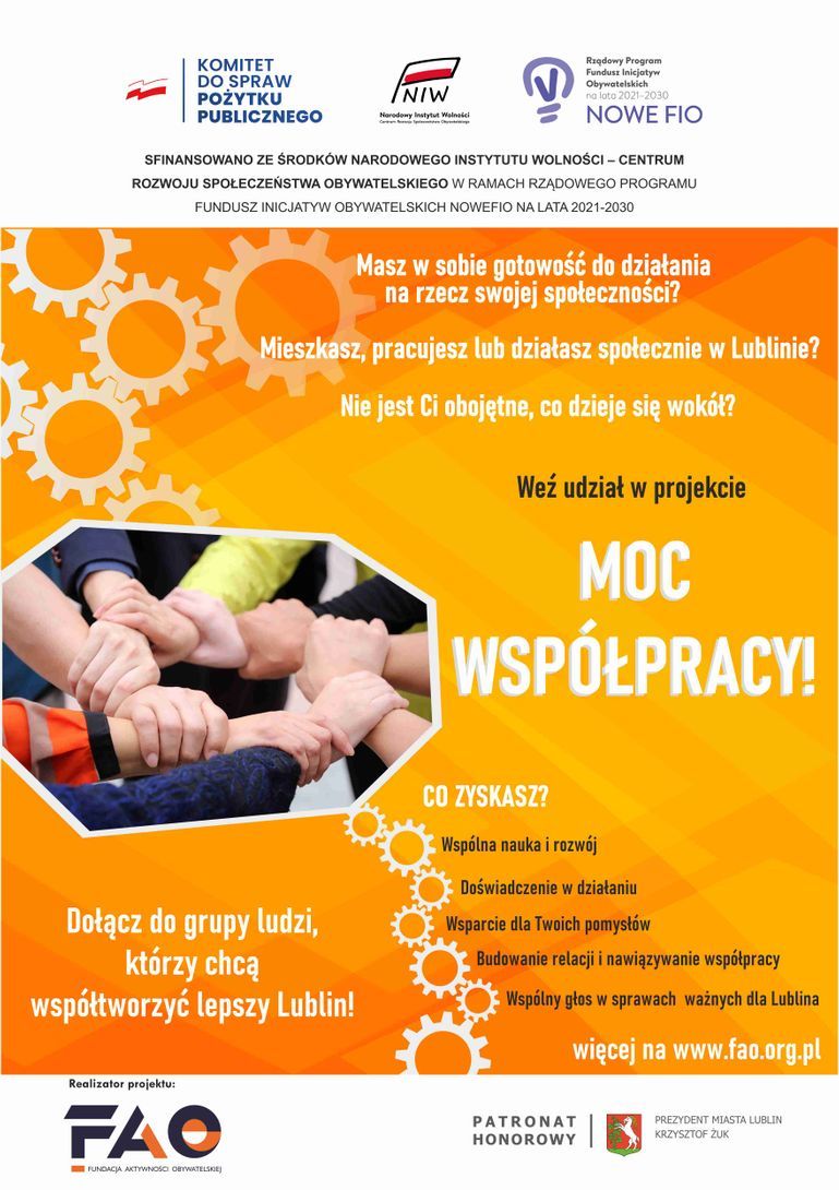 Jeśli działasz w Lublinie i nie są Ci obojętne sprawy innych – zostań liderem/liderką w projekcie Fundacji Aktywności Obywatelskiej „Moc Współpracy!”. Otrzymasz od nas wiedzę, wsparcie ekspertów i narzędzia do przeprowadzenia diagnozy lokalnych potrzeb. Nauczysz się, jak rozmawiać ze społecznością i jak wspólnie szukać rozwiązań.