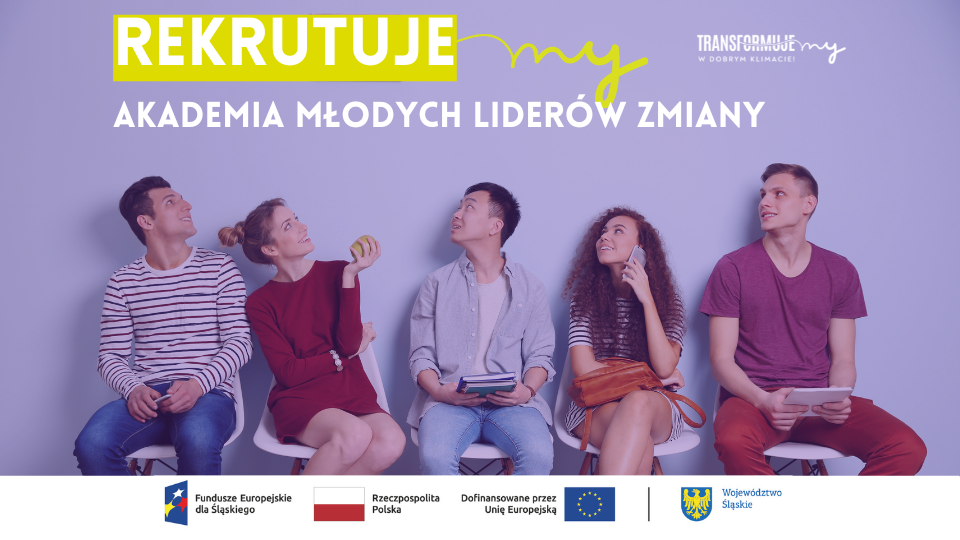 Grupa młodych liderów z uśmiechem patrzących na napis: Rekrutujemy. Akademia Młodych Liderów Zmiany. Logotyp projektu Transformujemy w dobrym klimacie!, Fundusze Europejskie dla Śląskiego, Flaga Polski, Unii Europejskiej, herb Województwa Śląskiego.