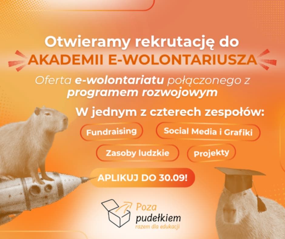 Dołącz do Akademii E-Wolontariusza Fundacji Poza Pudełkiem i rozwijaj się dzięki mentoringowi, szkoleniom i pracy przy realnych projektach! Wybierz jeden z 4 zespołów (grafika, projekty, HR, fundraising), zdobądź doświadczenie i zrób coś ważnego dla edukacji. Aplikuj do 30.09 – nie przegap tej szansy!