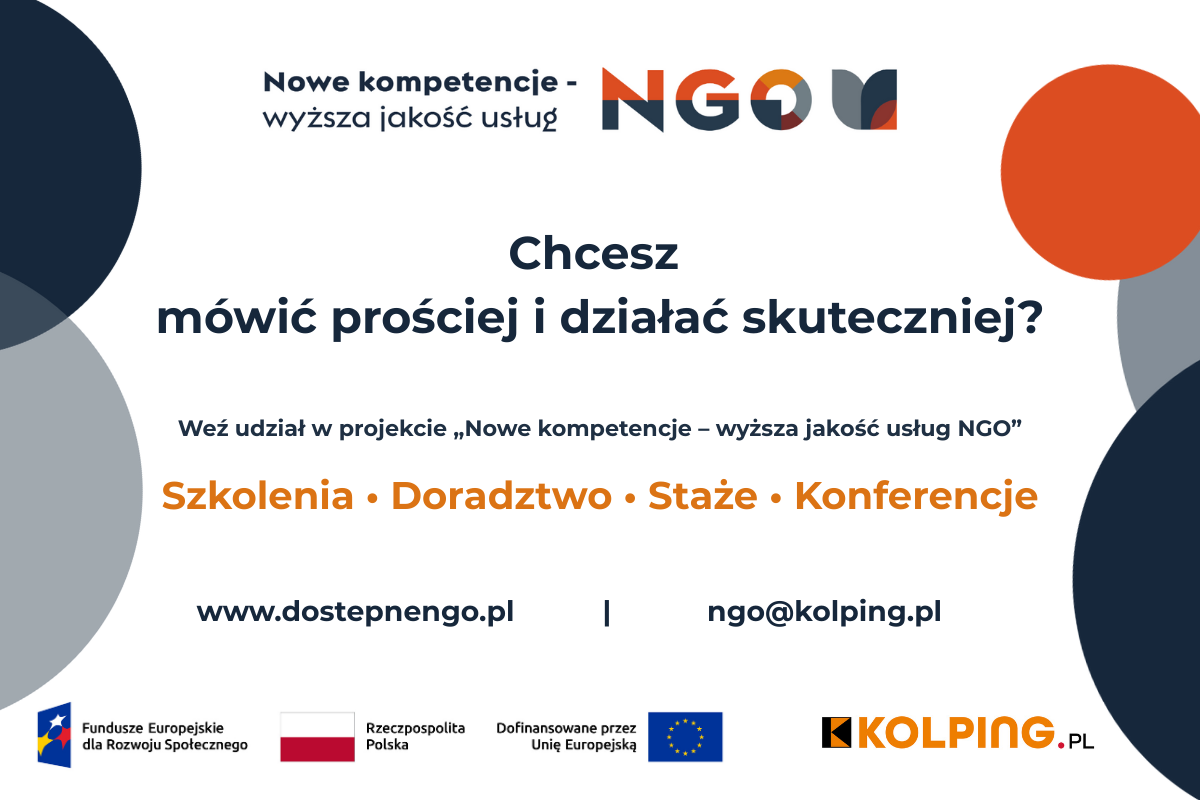 KOLPING Polska zaprasza przedstawicieli organizacji pozarządowych do udziału w projekcie „Nowe kompetencje – wyższa jakość usług NGO”. To ogólnopolska inicjatywa, która wspiera NGO w rozwoju kompetencji w obszarze dostępności. Oferujemy szkolenia, warsztaty, staże zawodowe, wizyty studyjne, konferencje oraz wsparcie doradcze. Działania realizujemy na terenie całej Polski. Projekt trwa do końca lutego 2027 roku.