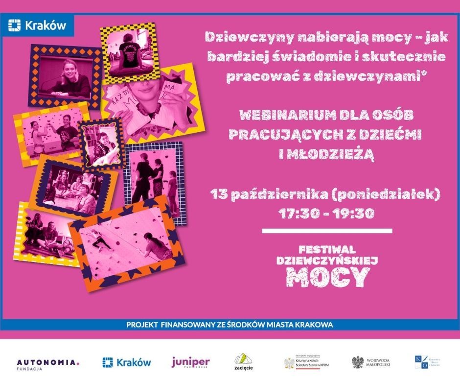 Grafika z kolażem zdjęć ilustrujące Dziewczyny* dyskutujące, przemawiające, wspinające się, nabierające mocy, śmiejące się. Tło różowe. Tekst: tytuł webinarium, data i godzina. Informacja o Festiwalu Dziewczyńskiej Mocy