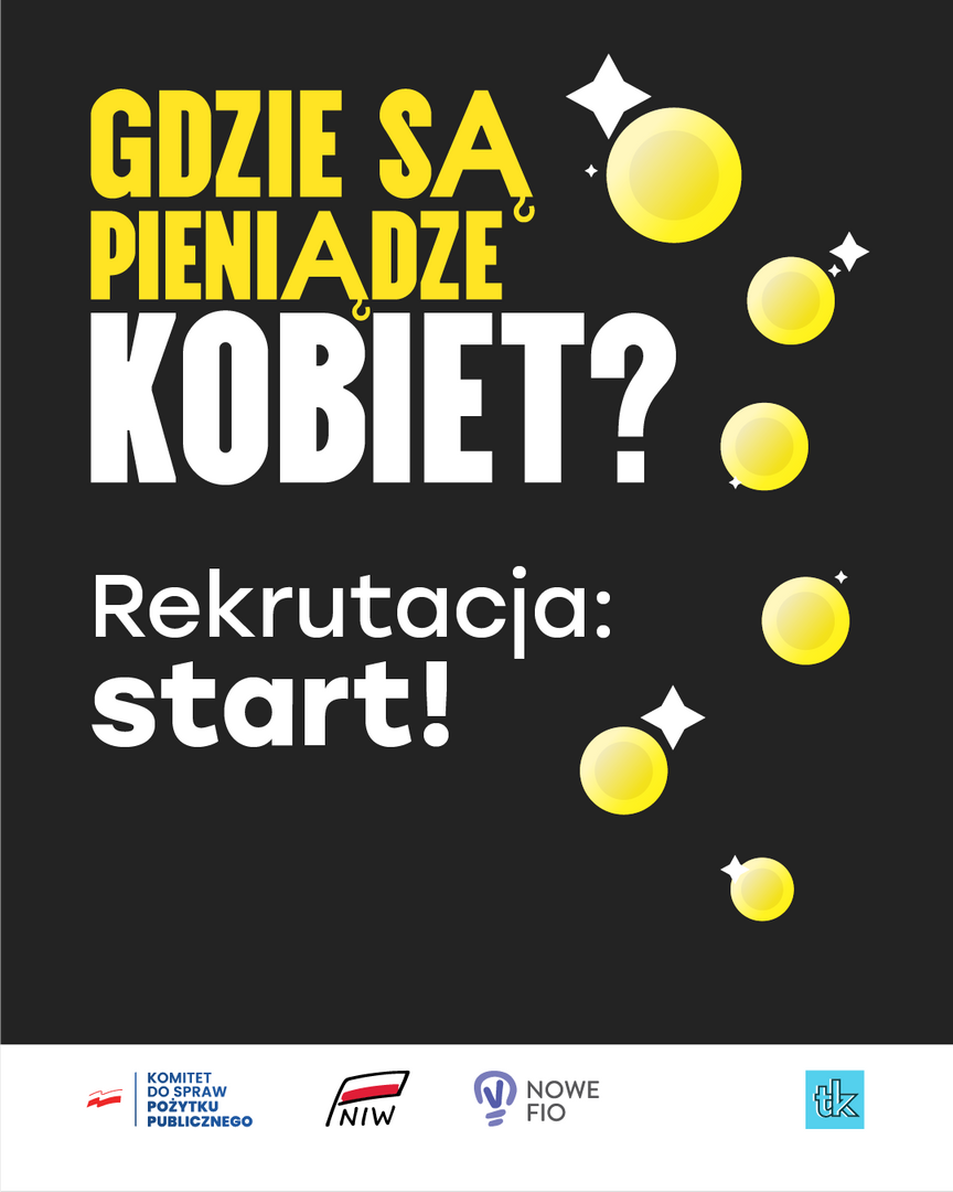 Czarna ilustracja z napisem "Gdzie są pieniądze kobiet? Rekrutacja: start!", złotymi krążkami przypominającymi monety i logotypami programu FIO i Stowarzyszenia Tkalnia.