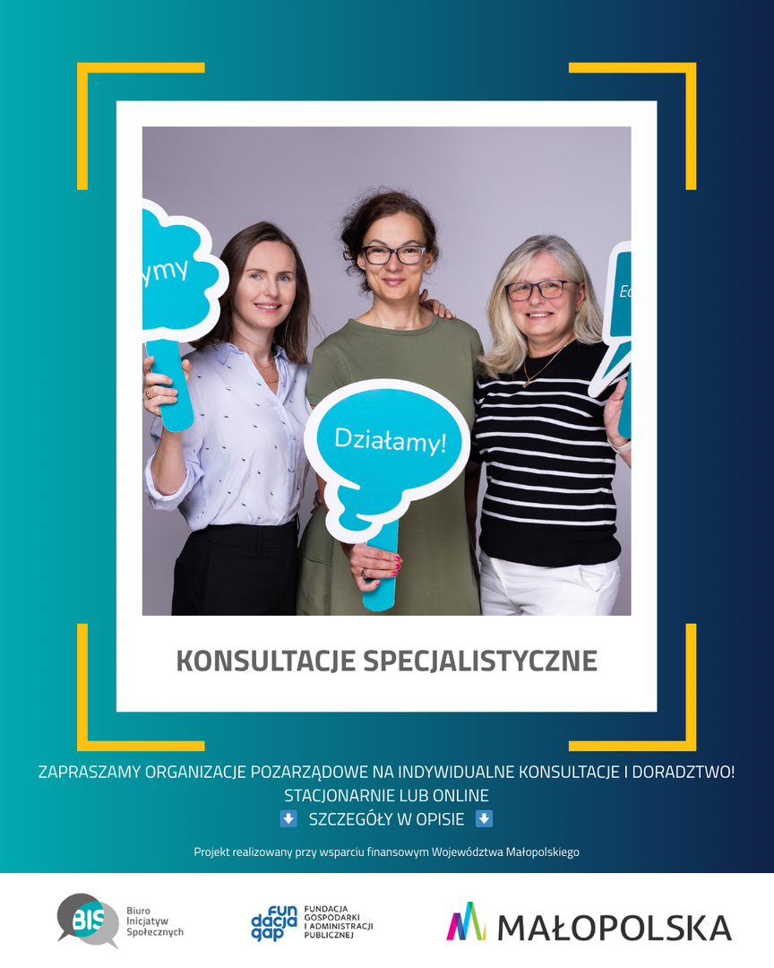 Konsultacje specjalistyczne, poniżej napis: zapraszamy organizacje pozarządowe na indywidualne doradztwo i konsultacje stacjonarnie lub online, szczegóły poniżej. Na dole logotypy: Fundacja BIS, Fundacja GAP i logotyp Małopolska. Na zdjęciu 3 uśmiechnięte kobiety i napis w chmurce "Działamy!"