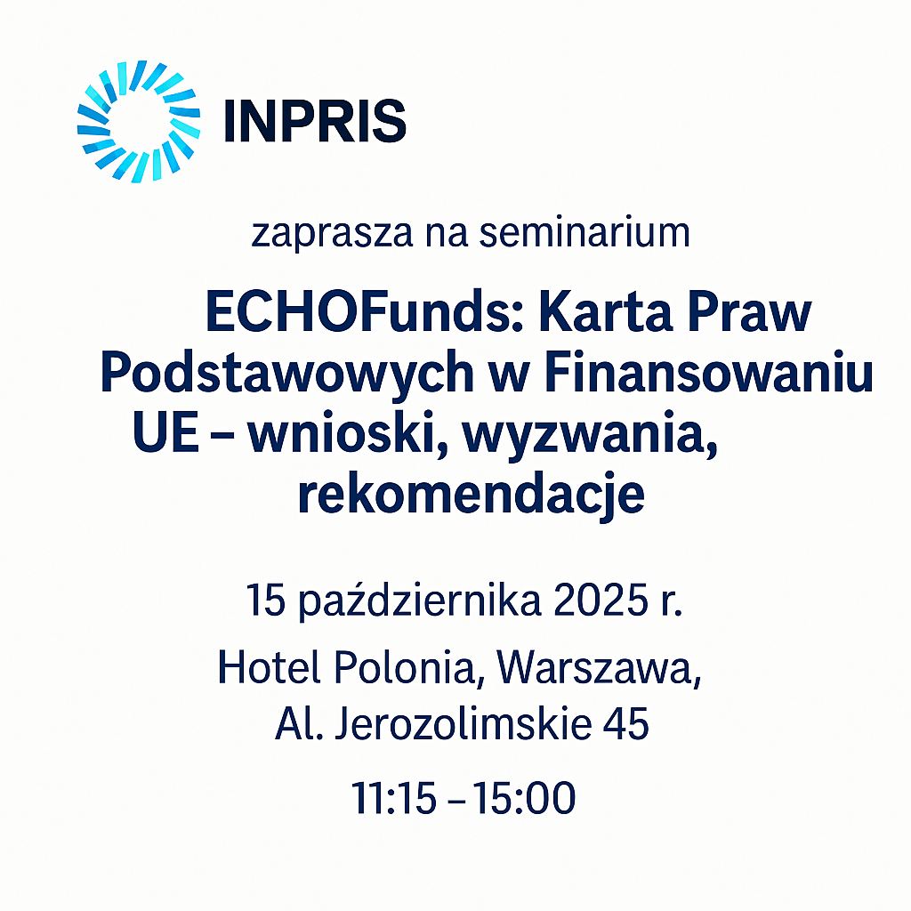 Instytut Prawa i Społeczeństwa INPRIS ma zaszczyt zaprosić Państwa na seminarium: „ECHOFunds: Karta Praw Podstawowych w Finansowaniu UE – wnioski, wyzwania, rekomendacje”, które odbędzie się 15 października 2025 r. w Hotelu Polonia w Warszawie, Al. Jerozolimskie 45 w godzinach 11:15 – 15:00.