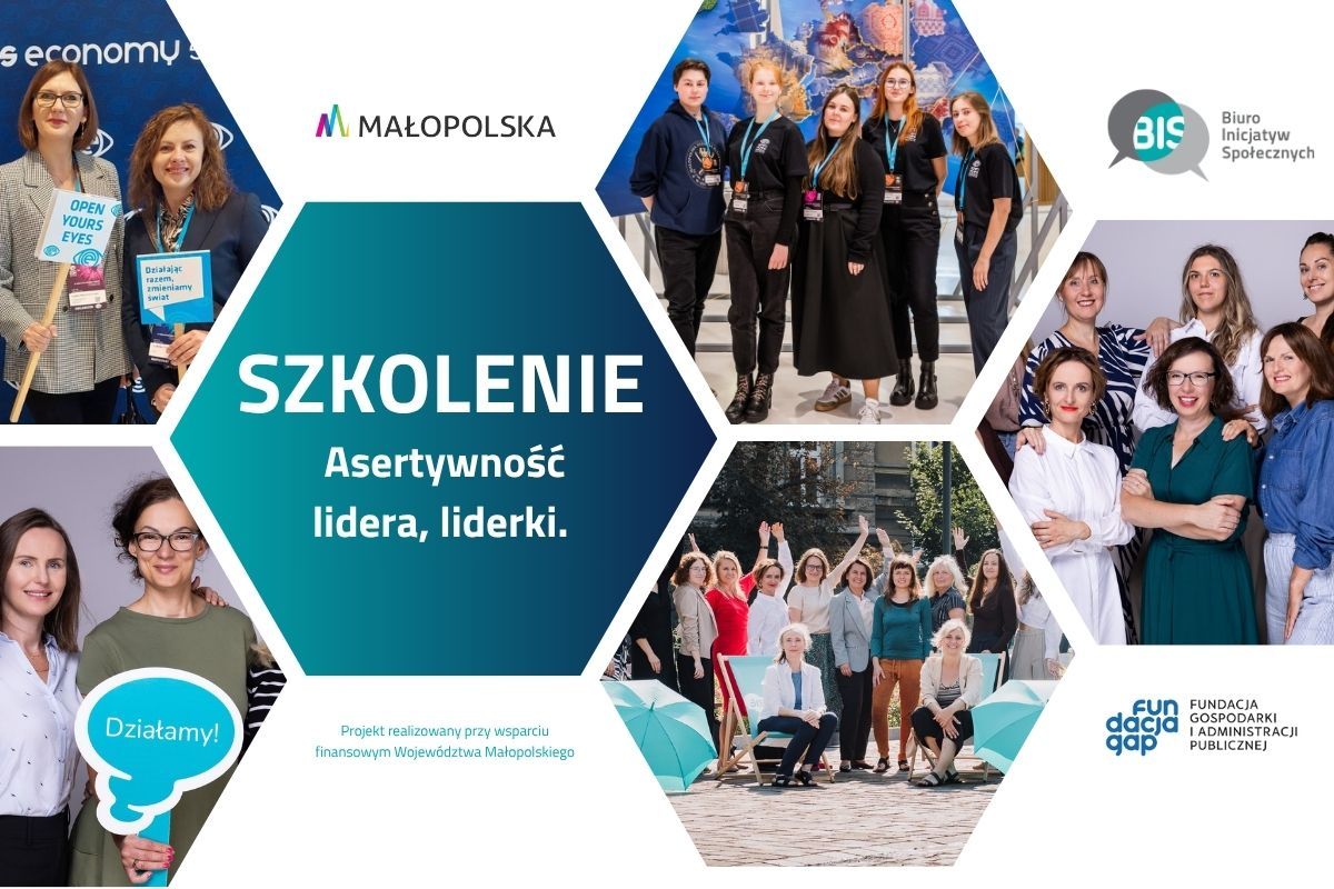 Plakat informujący o szkoleniu „Asertywność lidera, liderki”. W centralnej części grafiki znajduje się duży napis: „SZKOLENIE – Asertywność lidera, liderki”. Wokół umieszczono zdjęcia uśmiechniętych uczestniczek i uczestników różnych wydarzeń i projektów społecznych – stojących w grupach, trzymających tabliczki z hasłami „Działamy!”, „Open your eyes”, „Działając razem, zmieniamy świat”. Na górze widnieje logo Województwa Małopolskiego, po prawej stronie logo Biura Inicjatyw Społecznych (BIS), a w dolnym rogu – logo Fundacji Gospodarki i Administracji Publicznej (GAP). Na dole znajduje się informacja: „Projekt realizowany przy wsparciu finansowym Województwa Małopolskiego”. Kolorystyka plakatu utrzymana jest w odcieniach niebieskiego, turkusowego i bieli.
