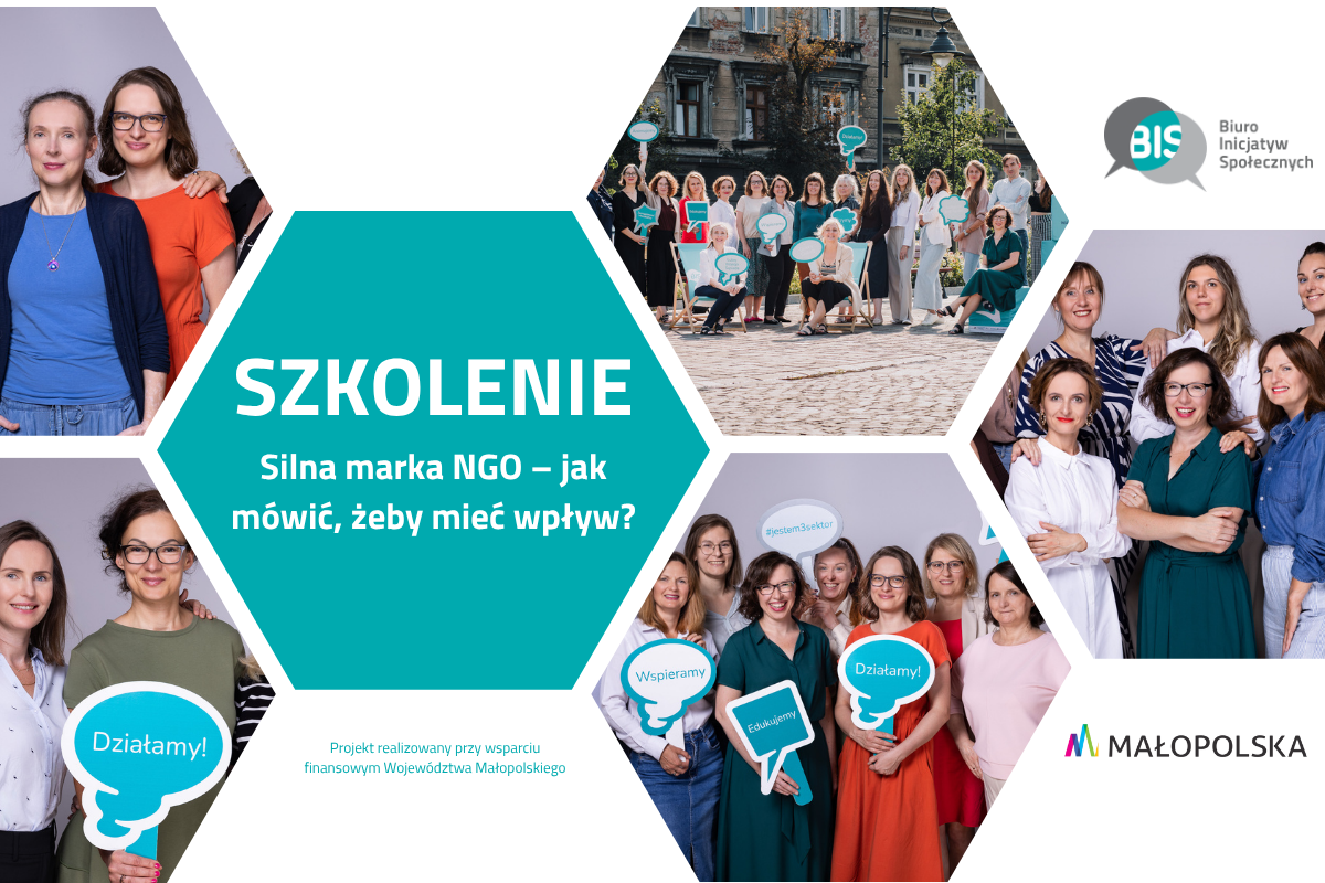 Grafika promująca szkolenie „Silna marka NGO – jak mówić, żeby mieć wpływ?”. Plakat zawiera elementy wizualne symbolizujące siłę komunikacji i rozwój marki NGO.