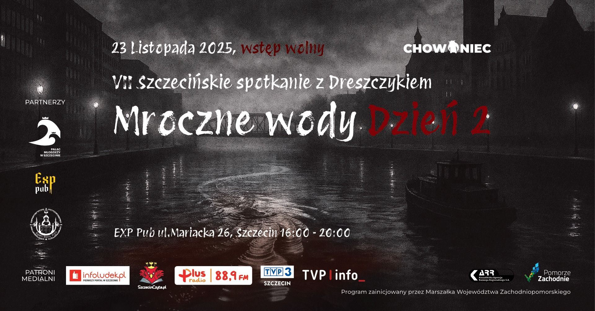 Grafika czarno-biała, z czerwonym śladem na wodzie. Przedstawia rzekę, most i bulwary miasta. Znajdują się również loga: Stowarzyszenia Chowaniec, Pomorza Zachodniego, KARR S.A. oraz patronów medialnych: Infoludek.pl, SzczecinCzyta.pl, Radio Plus Szczecin, TVP3 Szczecin i TVP Info, jak również loga Pałacu Młodzieży w Szczecinie, Exp Pubu i Rybałtów Dworu Gryfa oraz napisy: Program zainicjowany przez Marszałka Województwa Zachodniopomorskiego ; 23 listopada 2025 wstęp wolny ; VII Szczecińskie spotkanie z Dreszczykiem ; Mroczne wody Dzień 2 ; Exp Pub ul Mariacka 26, Szczecin, 16:00-20:00