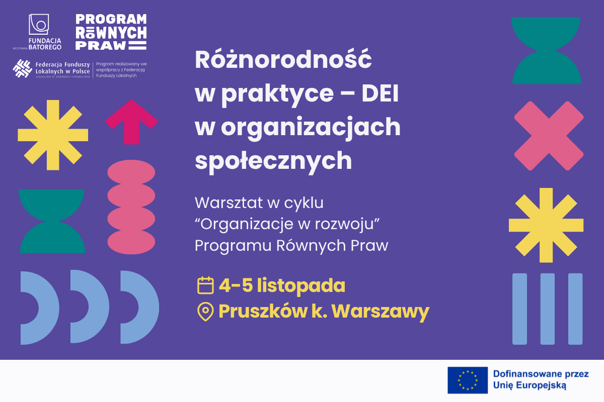 Na grafice są różnokolorowe kształty, a na środku napisy: Różnorodność w praktyce – DEI w organizacjach społecznych. Warsztat w cyklu “Organizacje w rozwoju” Programu Równych Praw. 4-5 listopada Pruszków k. Warszawy