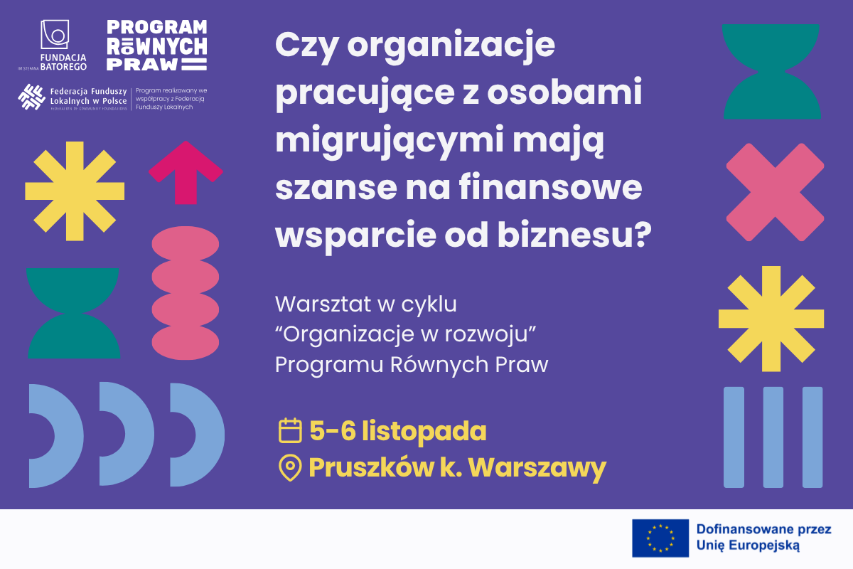 Grafika z fioletowym tłem i kolorowymi kształtami, na środku napisy: Czy organizacje pracujące z osobami migrującymi mają szanse na finansowe wsparcie od biznesu? Warsztat w cyklu “Organizacje w rozwoju” Programu Równych Praw 5-6 listopada Pruszków k. Warszawy. Warsztat w cyklu “Organizacje w rozwoju” Programu Równych Praw. 5-6 listopada Pruszków k. Warszawy