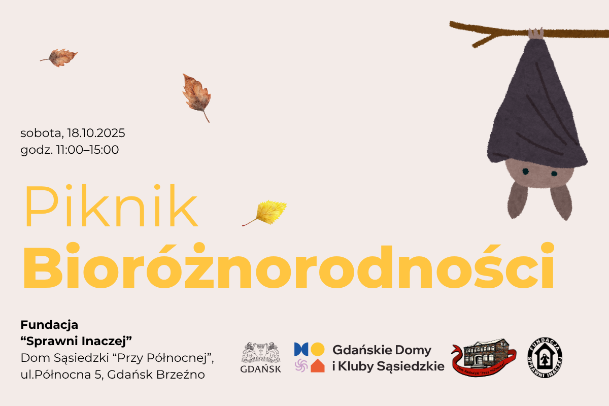 Grafika promująca wydarzenie „Piknik Bioróżnorodności”, które odbędzie się w sobotę 18 października 2025 roku w godz. 11:00–15:00 w siedzibie Fundacji Sprawni Inaczej przy ul. Północnej 5 w Gdańsku Brzeźnie. Na jasnym tle widać spadające jesienne liście oraz ilustrację nietoperza wiszącego głową w dół na gałęzi. Na dole znajdują się logotypy: Miasta Gdańska, Gdańskich Domów i Klubów Sąsiedzkich, Domu Sąsiedzkiego „Przy Północnej” oraz Fundacji „Sprawni Inaczej”.