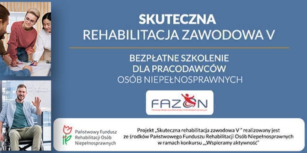 Skuteczna rehabilitacja zawodowa V projekt realizowany od dnia 2 stycznia 2025 r. do dnia 31 grudnia 2025 r. Fundacja Aktywizacji Zawodowej Osób Niepełnosprawnych FAZON zaprasza na BEZPŁATNE SZKOLENIE dla pracodawców osób niepełnosprawnych DATA I MIEJSCE SZKOLENIA: KRAKÓW 21.10.2025r. godz. 9:00