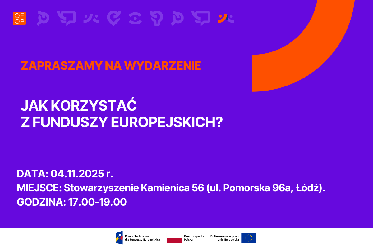 Zapraszamy na wydarzenie: Jak korzystać z Funduszy Europejskich? data: 04.11.2025, godz. 17.00. Miejsce: stowarzyszenie Kamienica 56 (ul. Pomorska 96a)