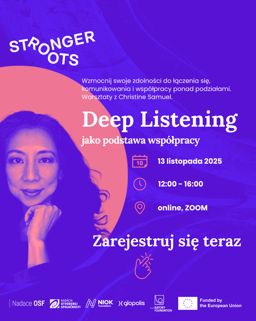 Serdecznie zapraszamy do udziału w warsztatach online, które odbędą się 13 listopada 2025 r. w godz. 12:00 –16:00. Warsztaty będą prowadzone w języku angielskim przez cenioną kanadyjską trenerkę, facylitatorkę i autorkę Christine Samuel. Dowiedz się, jak słuchanie może przyczynić się do znacznego przełomu w budowaniu zaufania i współpracy.