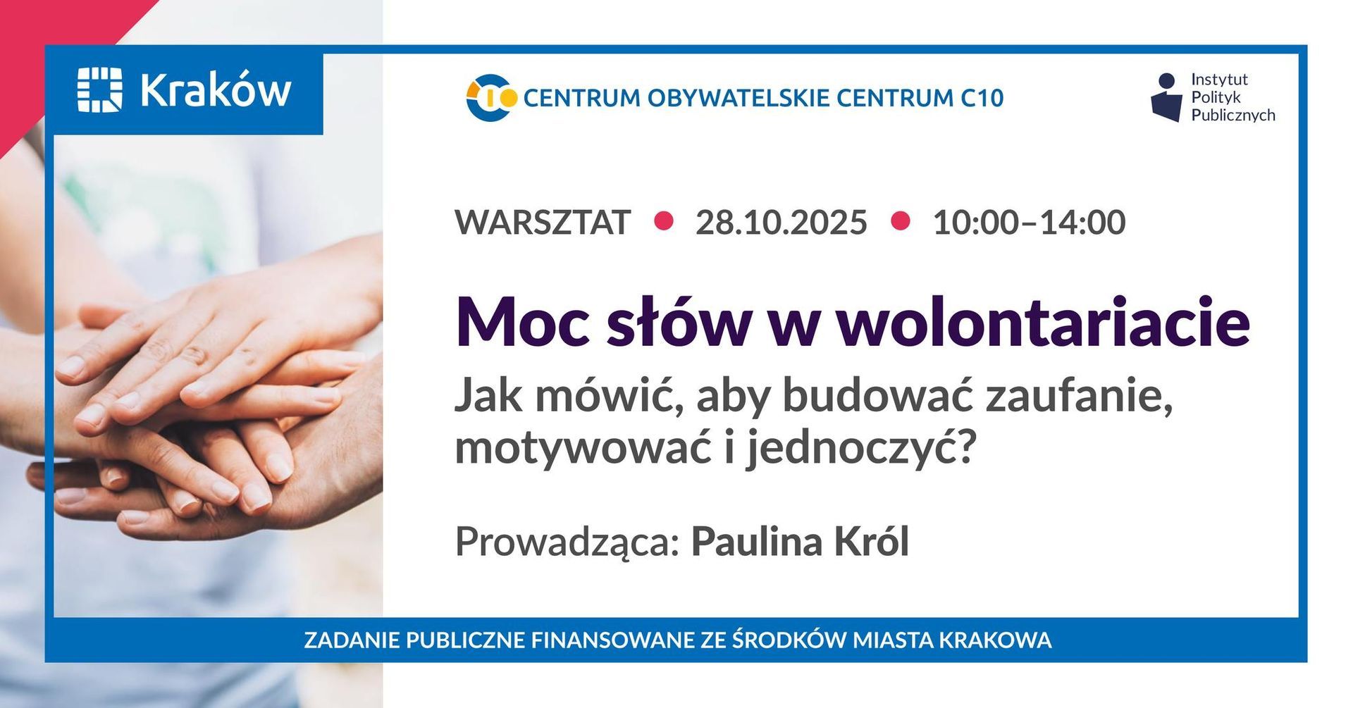 Fundacja Instytut Polityk Publicznych, operator Centrum Obywatelskiego Centrum C 10, zaprasza do udziału w wydarzeniu "Moc słów w wolontariacie. Jak mówić, aby budować zaufanie, motywować i jednoczyć?", podczas którego poznacie podstawy skutecznych przemówień publicznych, nauczycie się opowiadać o misji swojej organizacji w sposób angażujący i inspirujący, a także odkryjecie techniki budowania zaufania i motywacji poprzez słowo i postawę. 💬