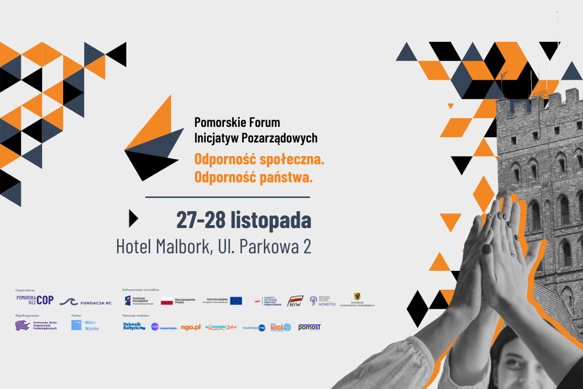 Grafika promująca Pomorskie Forum Inicjatyw Pozarządowych pod hasłem „Odporność społeczna. Odporność państwa.” Wydarzenie odbędzie się 27–28 listopada w Hotelu Malbork przy ul. Parkowej 2. Po lewej stronie widoczne są kolorowe trójkąty w barwach pomarańczowej, granatowej i czarnej, układające się w geometryczny wzór. Po prawej znajduje się czarno-biała fotografia fragmentu zamku w Malborku oraz dłoni kilku osób złożonych w geście wspólnego „przybicia piątki”. Na dole umieszczono logotypy organizatorów, partnerów i patronów medialnych wydarzenia.