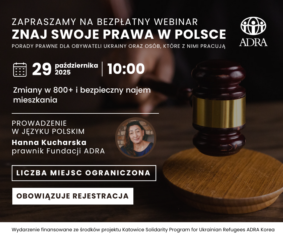 Po spotkaniu przewidziana jest możliwość zadawania pytań do prawniczki Fundacji ADRA – Hanny Kucharskiej, wyłącznie w zakresie tematów poruszonych podczas webinaru.
