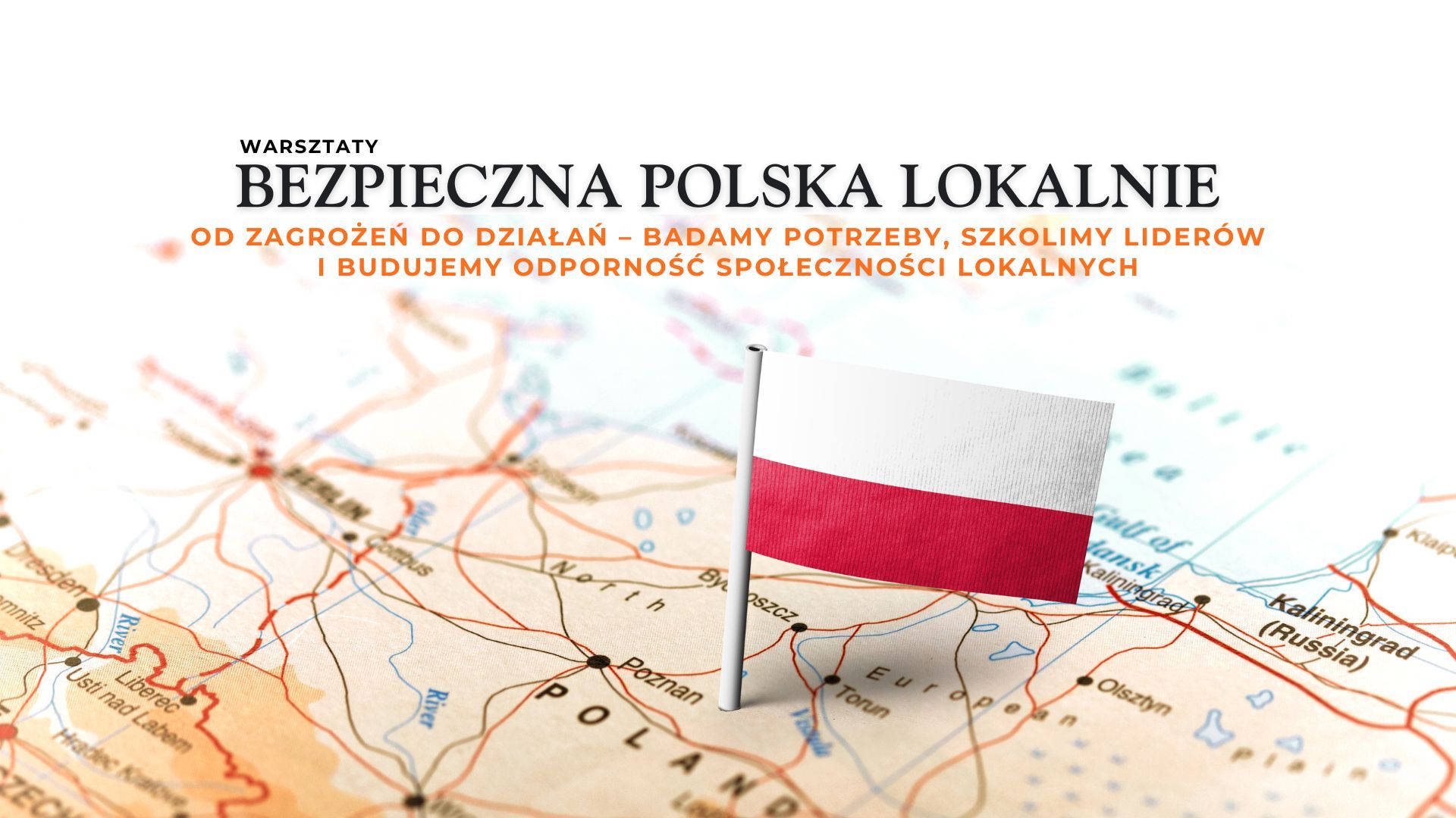 Flaga Polski na tle mapy Polski. U góry napis: Warsztaty bezpieczna Polska lokalnie. Od zagrożeń do działań - badamy potrzeby, szkolimy liderów i budujemy odporność społeczności lokalnych
