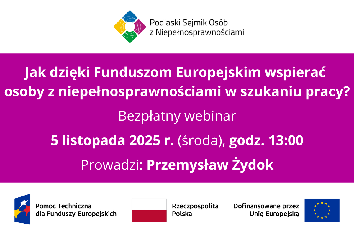 Grafika z napisami: Jak dzięki Funduszom Europejskim wspierać osoby z niepełnosprawnościami w szukaniu pracy? Bezpłatny webinar. 5 listopada 2025 r. (środa), godz. 13:00. Prowadzi: Przemysław Żydok. Na samej górze logo Podlaskiego Sejmiku Osób z Niepełnosprawnościami, na samym dole od lewej: logo Pomocy Technicznej dla Funduszy Europejskich oraz flagi Polski i UE, obok tej drugiej napis: Dofinansowane przez Unię Europejską.