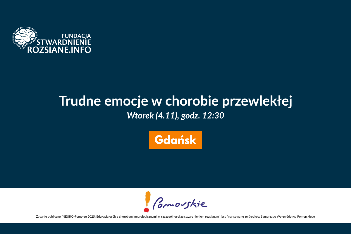 Trudne emocje w chorobie przewlekłej + wtorek 4.11 godz. 12:30 + Gdańsk + logo Fundacji + logo Pomorskie + opis że projekt jest finansowany ze środków samorządu województwa pomorskiego