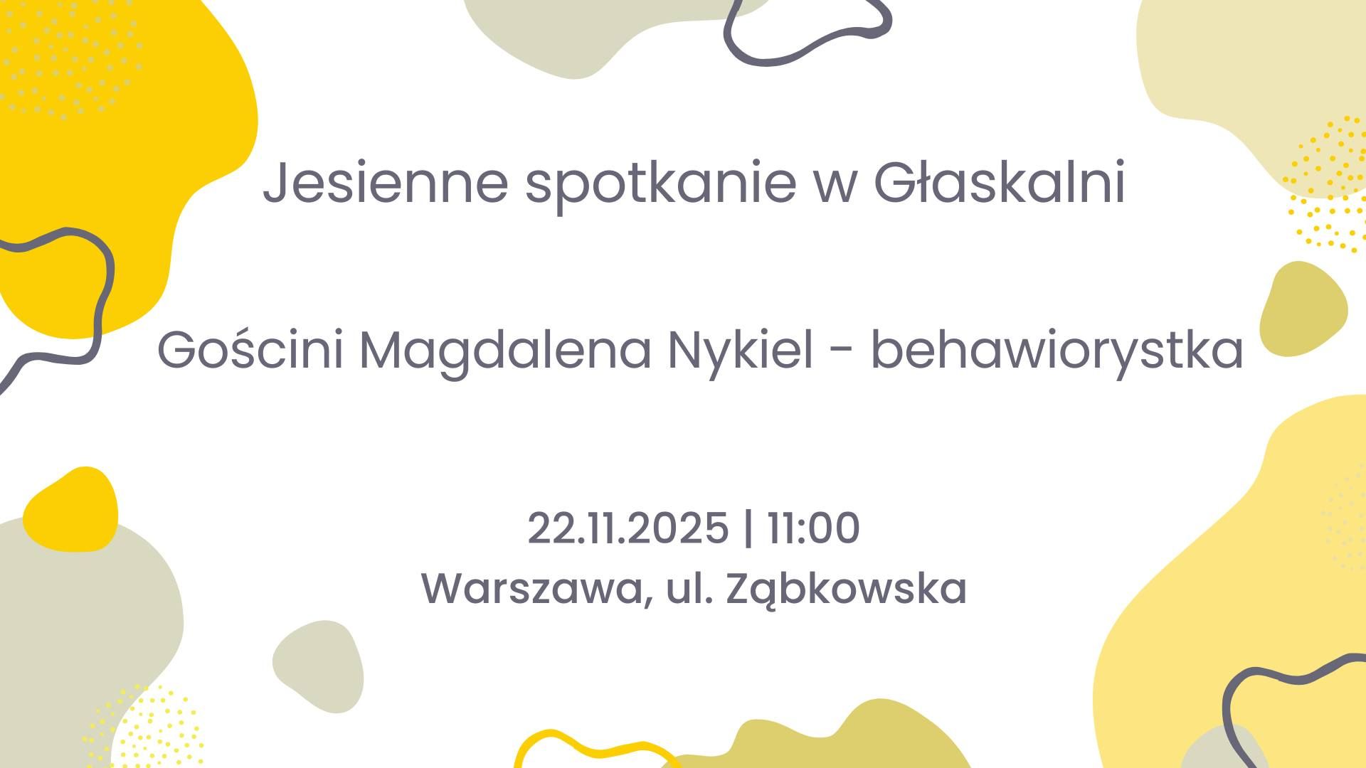 Na białym tle kilka kolorowych mazów. Napis: Jesienne spotkanie w Głaskalni. Kolejnego linijka: Gościni Magdalena Nykiel - behawiorystka. Kolejne linijka: 22.11.2025 11:00. Kolejna Linijka: Warszawa, ul. Ząbkowska.