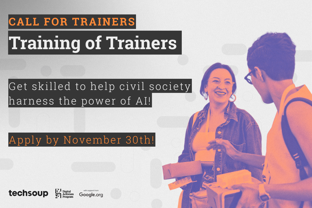 Grafika promująca nabór trenerów w ramach projektu Fundacji TechSoup "AI for Social Change". Po lewej stronie napis: 'Call for Trainers – Training of Trainers. Zdobądź umiejętności, aby pomóc społeczeństwu obywatelskiemu wykorzystać potencjał sztucznej inteligencji! Aplikuj do 30 listopada!'. Po prawej stronie dwie osoby rozmawiające podczas wydarzenia, uśmiechnięte i trzymające materiały szkoleniowe. Na dole logotypy TechSoup, Digital Activism Program i Google.org.
