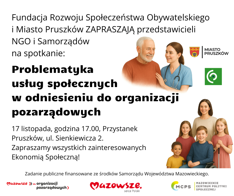 Fundacja Rozwoju Społeczeństwa Obywatelskiego i Miasto Pruszków zapraszają na spotkanie informacyjne pt.: Problematyka Usług Społecznych w odniesieniu do organizacji pozarządowych. Spotkanie odbędzie się w poniedziałek, 17 listopada o godzinie 17.00 w Przystanku Pruszków, przy ul. Sienkiewicza 2 w Pruszkowie. Jest to impreza dla wszystkich NGO i Samorządów, których interesuje dobro i rozwój społeczności Powiatu Pruszkowskiego.
