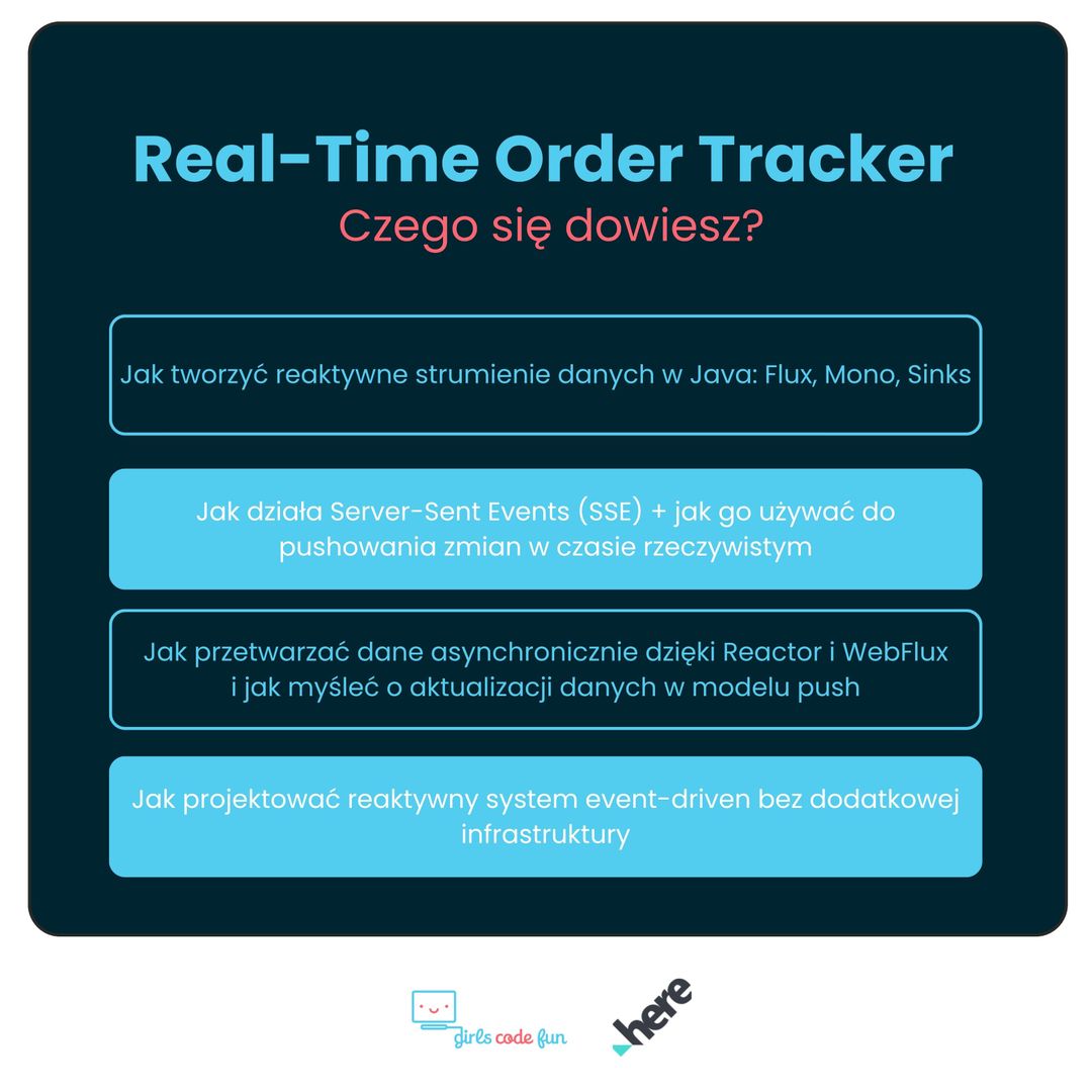 Podczas bezpłatnego warsztatu „Real-Time Order Tracker - system zamówień na żywo w Javie” uczestniczki stworzą od podstaw działający system do śledzenia zamówień w czasie rzeczywistym. Wykorzystamy Spring WebFlux i Server-Sent Events (SSE). Rezultatem będzie w pełni funkcjonalna aplikacja przypominająca panel sklepu internetowego, w której zobaczymy, jak zamówienia pojawiają się, zmieniają status i znikają po dostarczeniu. Cały proces przebiega w czasie rzeczywistym dzięki reaktywnemu modelowi WebFlux.