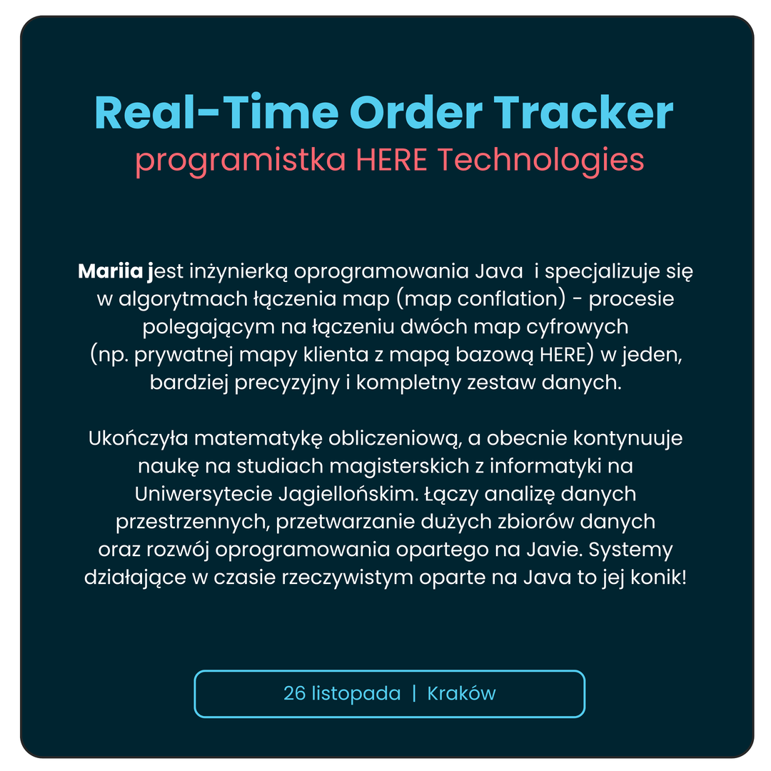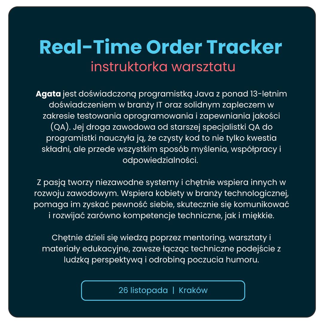 Zapraszamy na warsztat „Real-Time Order Tracker - tworzymy system zamówień na żywo w Javie!” To praktyczne doświadczenie, które wpiszesz do portfolio i dowód Twoich kompetencji w świecie IT.