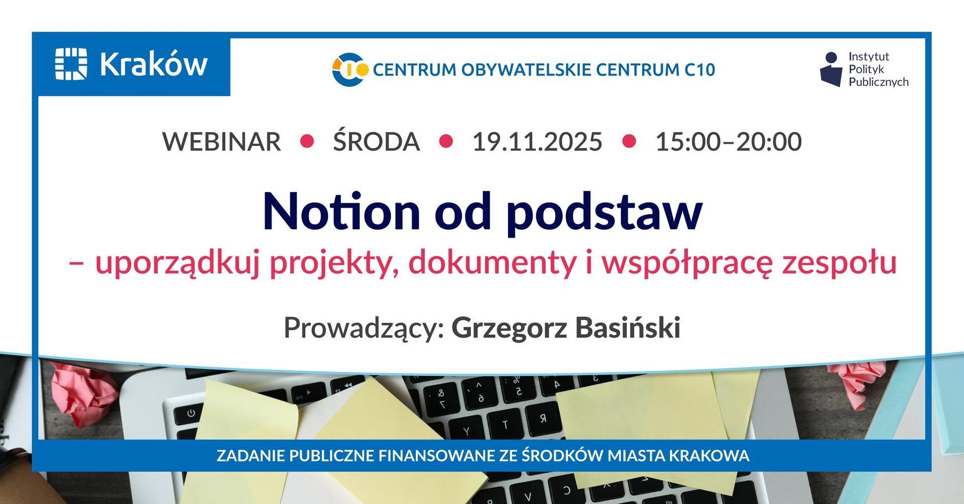 Centrum Obywatelskie Centrum C 10 oraz Fundacja Instytut Polityk Publicznych serdecznie zapraszają na bezpłatne szkolenie online: „Notion od podstaw – uporządkuj projekty, dokumenty i współpracę zespołu”.