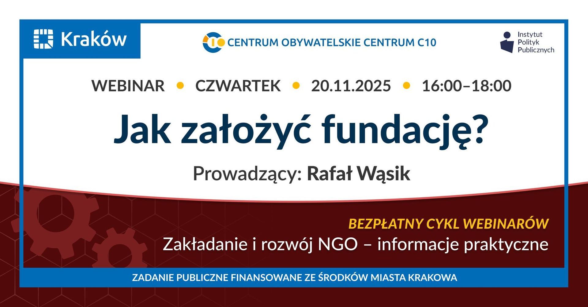 Fundacja Instytut Polityk Publicznych, operator Centrum Obywatelskiego Centrum C 10, zaprasza do udziału w bezpłatnym webinarze pt. "Jak założyć fundację" - pierwszego z cyklu "Zakładanie i rozwój NGO - informacje praktyczne". Webinar odbędzie się 20 listopada (czwartek), w godzinach 16:00-18:00.