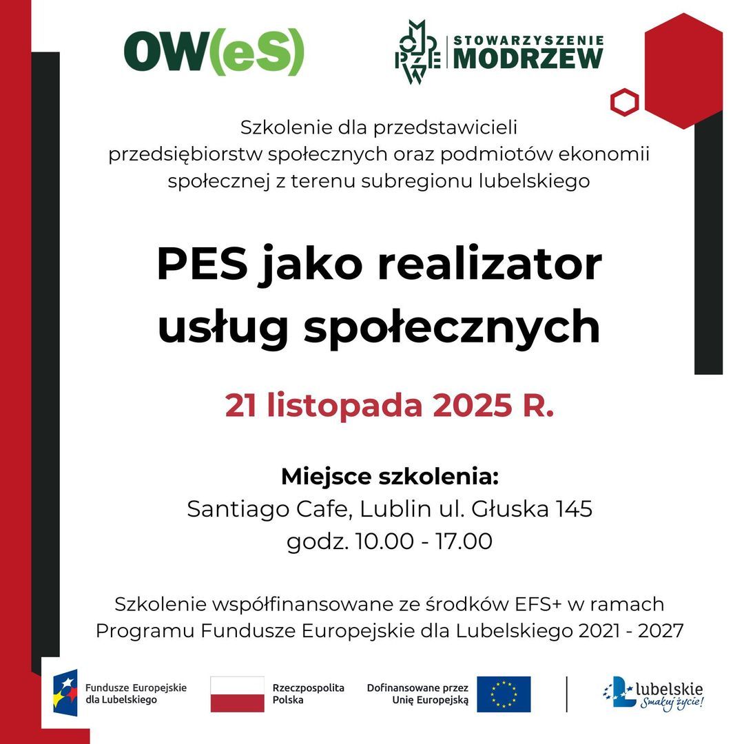 Ośrodek Wsparcia Ekonomii Społecznej zaprasza do udziału w bezpłatnym szkoleniu współfinansowanym ze środków EFS+ w ramach Programu Fundusze Europejskie dla Lubelskiego 2021 – 2027 „PES jako realizator usług społecznych”.