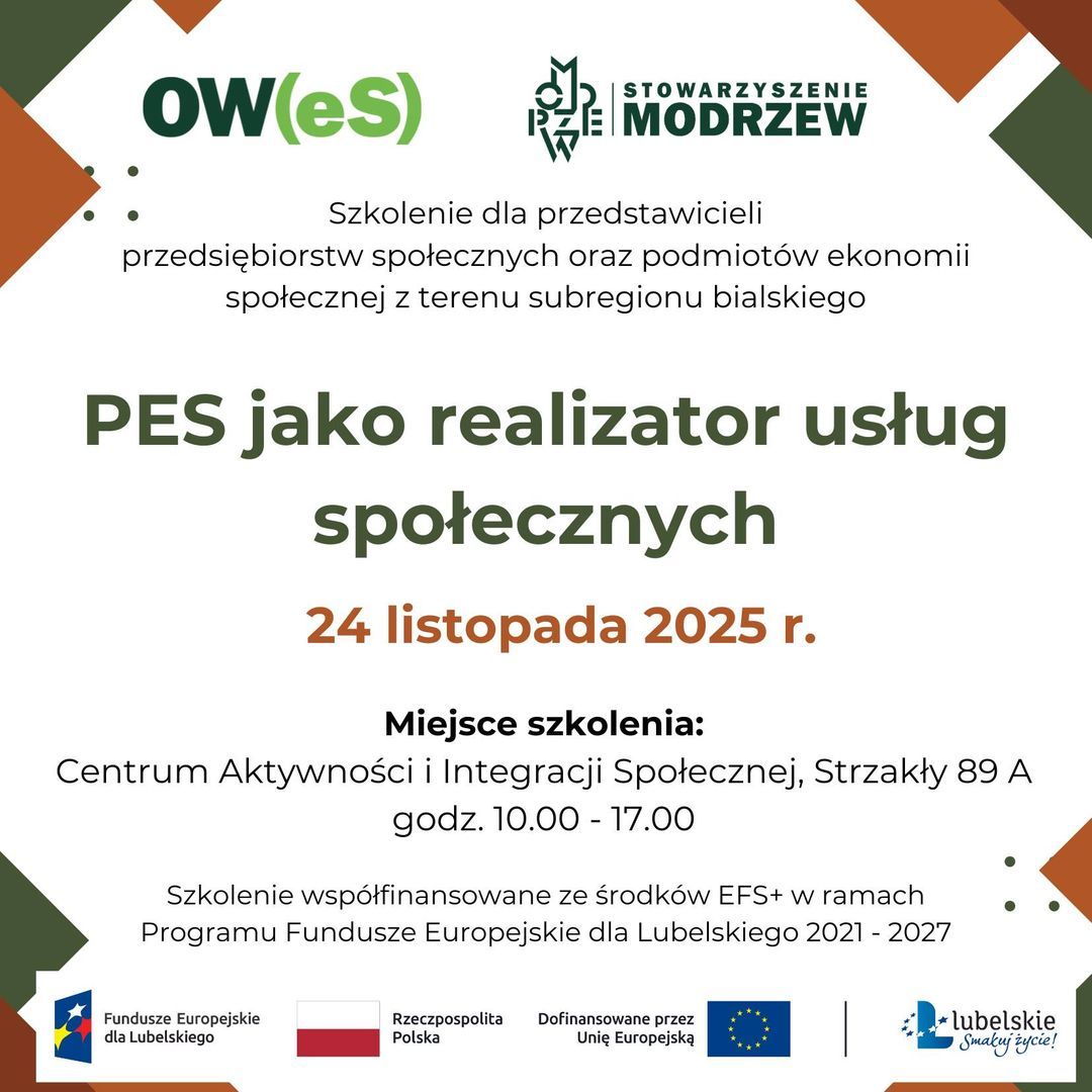 Ośrodek Wsparcia Ekonomii Społecznej zaprasza do udziału w bezpłatnym szkoleniu współfinansowanym ze środków EFS+ w ramach Programu Fundusze Europejskie dla Lubelskiego 2021 – 2027 „PES jako realizator usług społecznych”.
