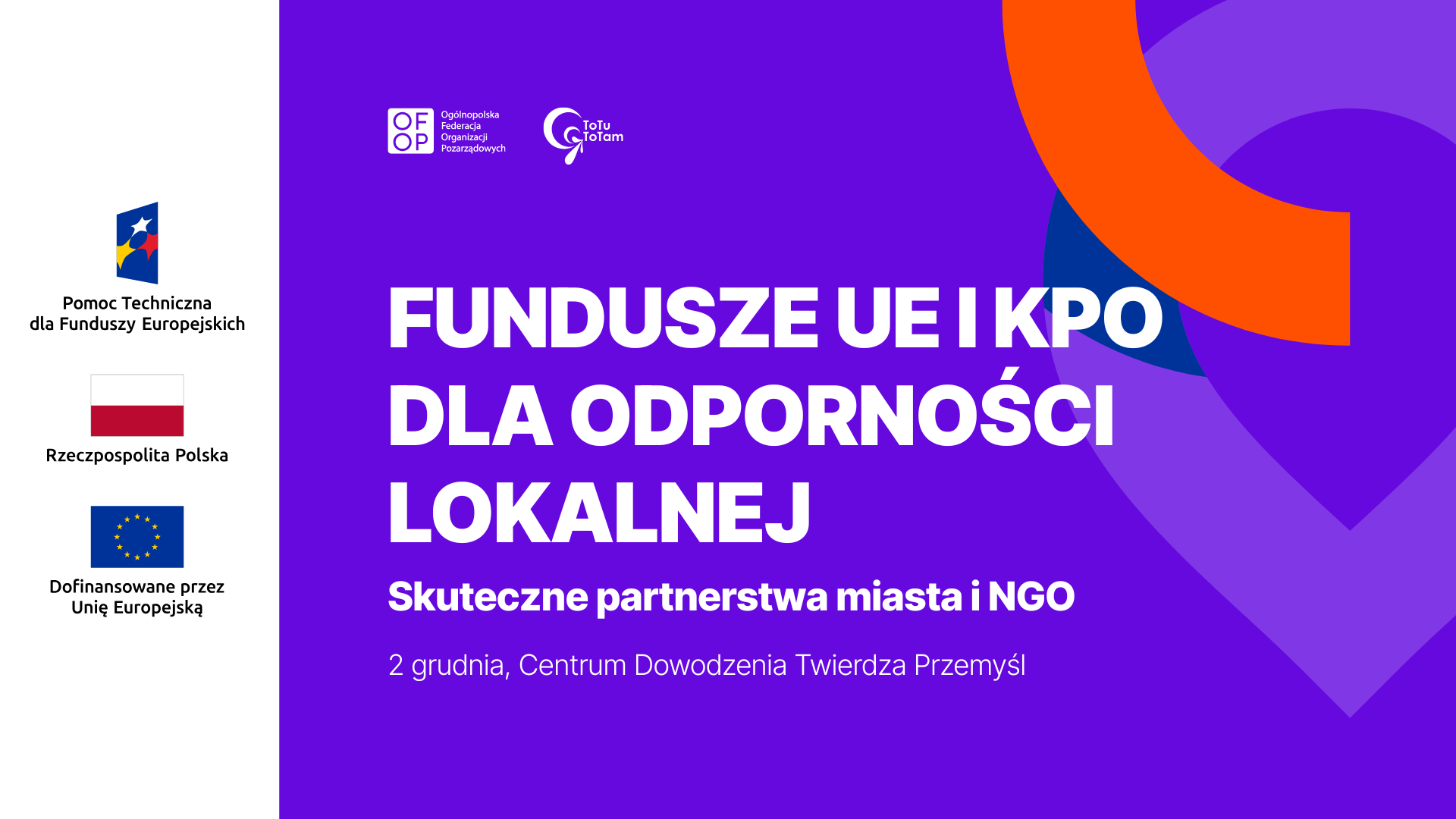 Grafika promocyjna konferencji „Fundusze UE i KPO dla odporności lokalnej – skuteczne partnerstwa miasta i NGO”. Na fioletowym tle widoczne są logotypy OFOP i Fundacji toTU toTAM oraz napisy z datą i miejscem wydarzenia: „2 grudnia, Centrum Dowodzenia Twierdza Przemyśl”. Po lewej stronie znajdują się trzy znaki: Pomoc Techniczna Funduszy Europejskich, flaga Polski i flaga Unii Europejskiej z informacją o dofinansowaniu.