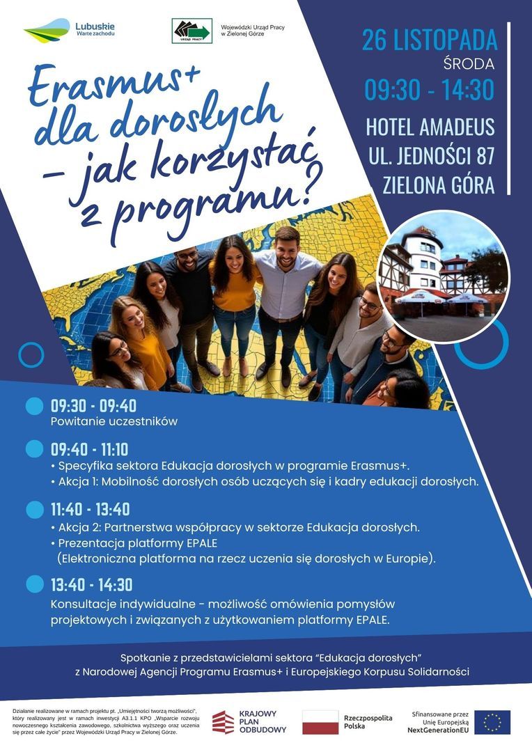 Plakat Erasmus+ dla dorosłych - jak korzystać z programu? 26.11.2025, Zielona góra, 09:30 - 14:30, Zielona Góra