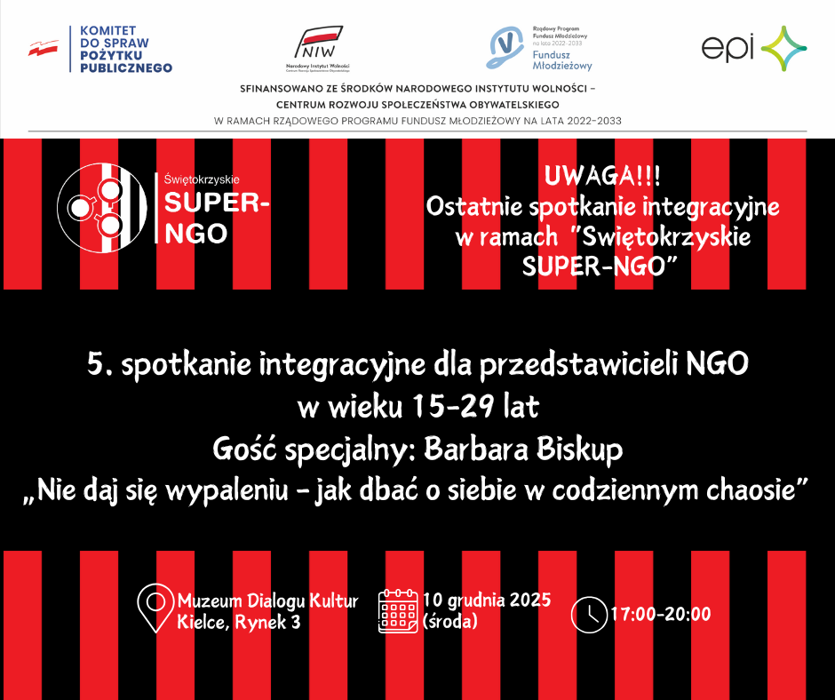 UWAGA!!! Ostatnie spotkanie integracyjne w ramach “Swiętokrzyskie SUPER-NGO” 5. spotkanie integracyjne dla przedstawicieli NGO w wieku 15-29 lat Gość specjalny: Barbara Biskup „Nie daj się wypaleniu – jak dbać o siebie w codziennym chaosie” Miejsce: Muzeum Dialogu Kultur Kielce, Rynek 3 Data: 10 grudnia 2025 (środa) czas: 17:00-20:00