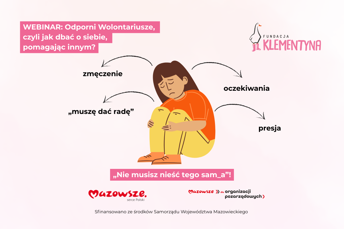 Grafika webinaru „Odporni wolontariusze - jak dbać o siebie, pomagając innym?”. Na środku ilustracja przygnębionej osoby siedzącej ze ściągniętymi kolanami. Wokół niej hasła: „zmęczenie”, „muszę dać radę”, „oczekiwania”, „presja”. Na dole napis: „Nie musisz nieść tego sam_a!”. Na górze logo Fundacji Klementyna, na dole logotypy Samorządu Województwa Mazowieckiego.