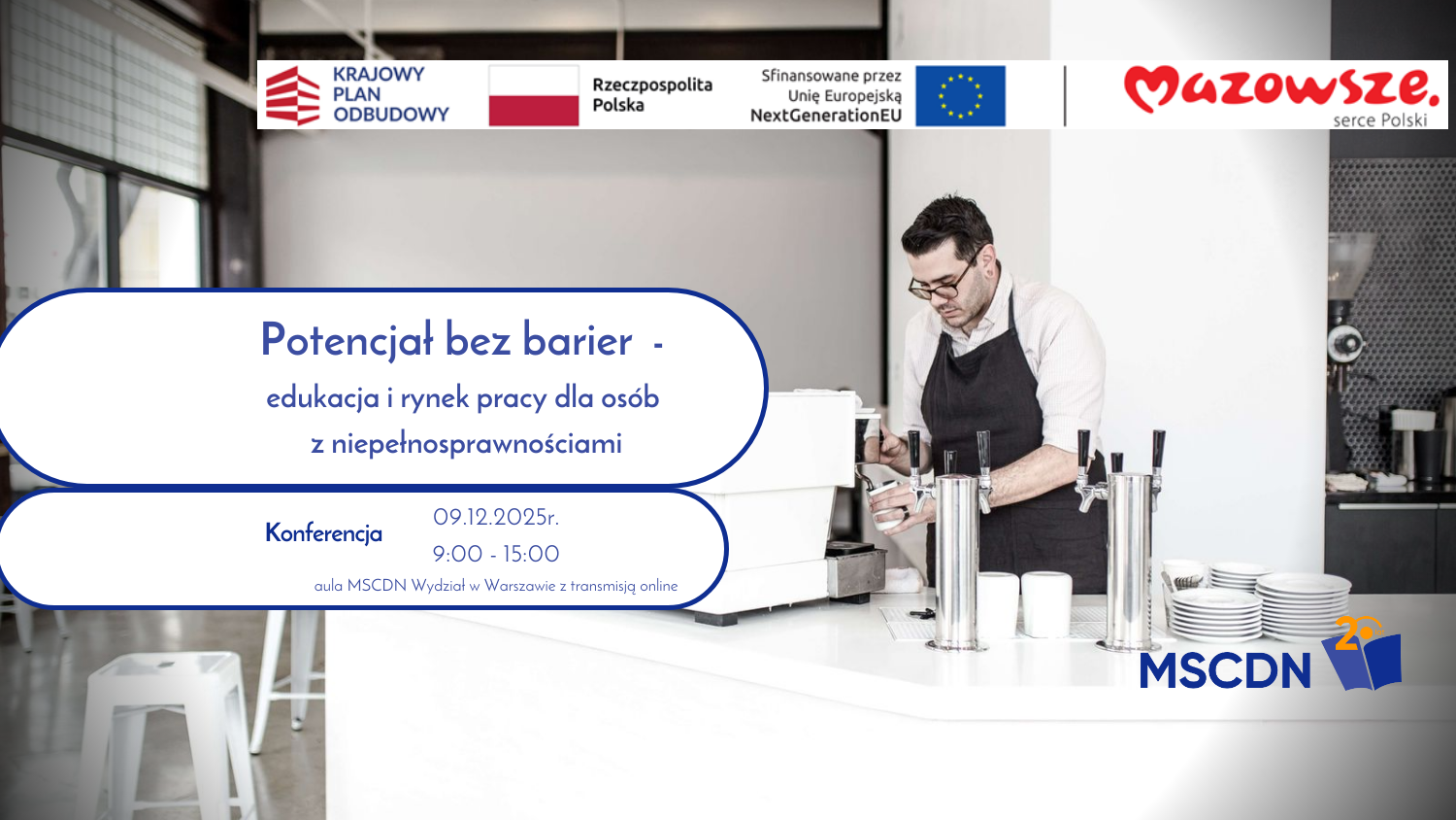 Ilustracja przedstawia baristę obsługującego ekspres do kawy, ma na sobie czarny fartuch, pod spodem białą koszulę, nosi okulary. Na pierwszym planie znajdują się dystrybutory napojów i białe talerze. Wnętrze za mężczyzną utrzymane jest w kolorach bieli i jasnej szarości. Po lewej stronie znajduje się informacje na temat konferencji: Potencjał bez barier - edukacja i rynek pracy dla osób z niepełnosprawnościami. drugi rząd informacja: Konferencja 0.12.2025r., czas trwania od 9:00 do 15:00, miejsce: aula MSCDN Wydział w Warszawie z transmisją online. Na górze pasek z informacjami: Krajowy Plan Odbudowy, flaga biało - czerwona z napisem Rzeczpospolita Polska, Flaga Unii Europejskiej - żółte gwiazdy ułożone w kształt okręgu na niebieskim tle, obok napis Sfinansowane przez Unię Europejską NextGenerationEU, napis: Mazowsze serce Polski. W prawym dolnym rogu napis MSCDN.