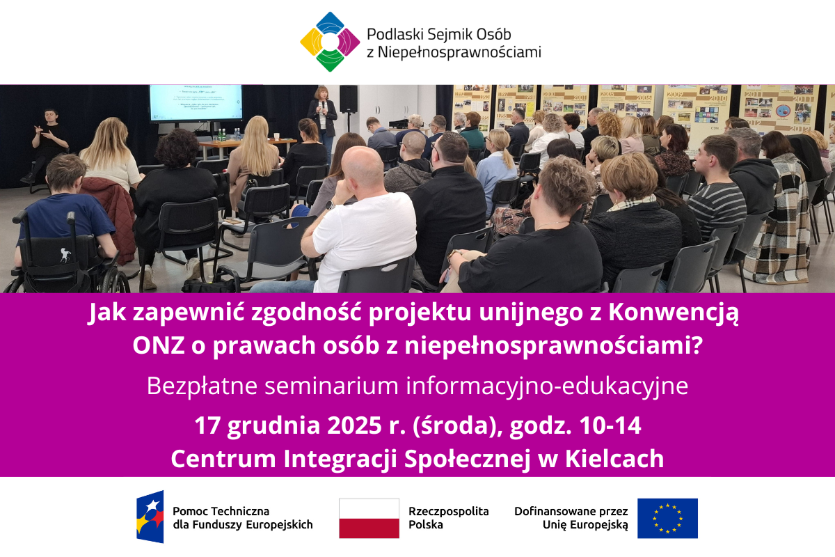Zdjęcie ludzi siedzących na krzesłach podczas seminarium i słuchających mówiącej w tle prelegentki. Niżej napisy: Jak zapewnić zgodność projektu unijnego z Konwencją ONZ o prawach osób z niepełnosprawnościami? Bezpłatne seminarium informacyjno-edukacyjne. 17 grudnia 2025 r. (środa), godz. 10-14. Centrum Integracji Społecznej w Kielcach. Na samej górze loga od lewej: Podlaskiego Sejmiku Osób z Niepełnosprawnościami, na samym dole od lewej: logo Pomocy Technicznej dla Funduszy Europejskich oraz flagi: Polski i UE, obok tej drugiej napis: Dofinansowane przez Unię Europejską