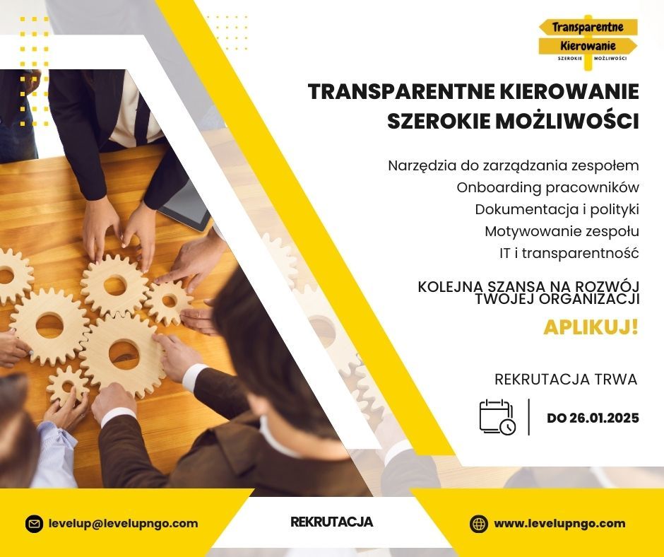 Rozpoczynamy rekrutację do konsultacji eksperckich w projekcie „Transparentne Kierowanie, Szerokie Możliwości”. W 2026 r. wesprzemy 8 NGO, oferując diagnozę i do 22 godzin indywidualnych konsultacji m.in. z zakresu IT, dokumentacji, onboardingu, systemów motywacyjnych i narzędzi cyfrowych. Rekrutacja trwa do 26.01.2026. Zajęcia online. Zaaplikuj: https://forms.gle/mkosLkT4crqyqiiR6