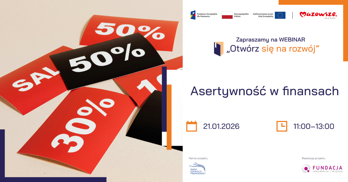 Czy Twoje pieniądze pracują tak, jak chcesz? A może chcesz nauczyć się mówić „nie” niekorzystnym decyzjom finansowym? Zapraszamy na bezpłatny webinar z edukacji finansowej: „Asertywność w finansach” 21.01.2026 r. 11:00–13:00. Platforma Zoom