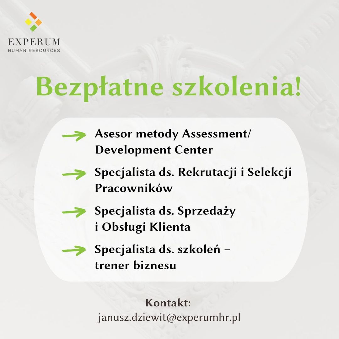 Szkolenia w 100% finansowane z Europejskiego Funduszu Społecznego! Do wyboru cztery ścieżki rozwoju: 👉 Asesor Metody Assessment/Development Center 👉 Specjalista ds. Rekrutacji i Selekcji Pracowników 👉 Specjalista ds. Sprzedaży i Obsługi Klienta 👉 Specjalista ds. Szkoleń – Trener Biznesu Więcej informacji: https://experumhr.pl/pl/bezp%C5%82atne_szkolenia/